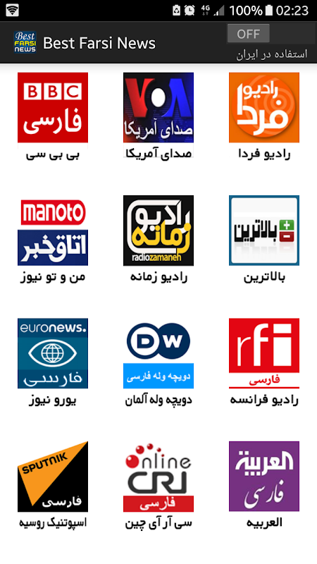 bbc persian - voa ( voice of america ) persian - radio farda - manoto tv news - radio zamaneh - balatarin - euronews ( euro news farsi ) - Deutsche Welle farsi - radio france farsi - sputnik russia farsi - china radio farsi - al arabiya farsi