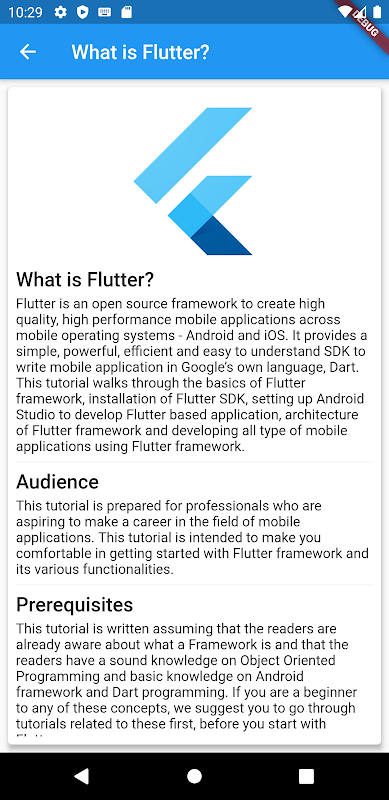 Flutter is an open source framework to create high quality, high performance mobile applications across mobile operating systems - Android and iOS. It provides a simple, powerful, efficient and easy to understand SDK to write mobile application in Google’s own language, Dart. This tutorial walks through the basics of Flutter framework, installation of Flutter SDK, setting up Android Studio to develop Flutter based application, architecture of Flutter framework and developing all type of mobile applications using Flutter framework.