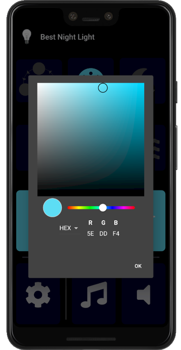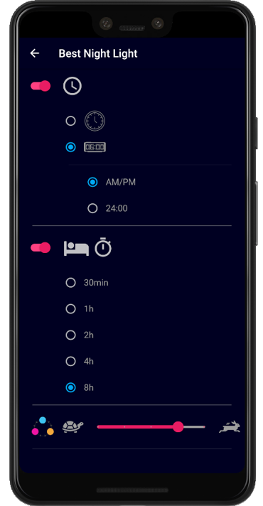 Change the in-app settings to add a sleep timer, display a digital or analog clock on the night light, change the speed that the colors rotate to change the mood light, and more!