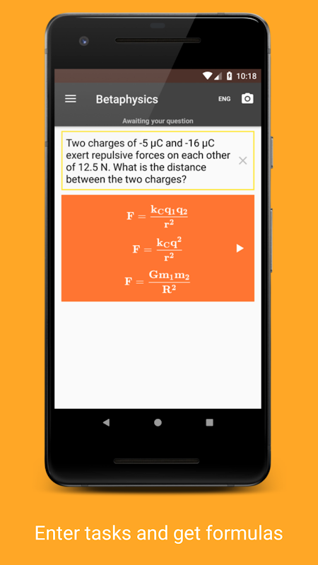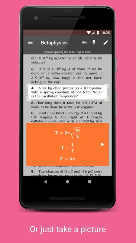 Just type the text of the problem or question for physics and Artificial Intelligence will instantly prompt you equations, laws and formulas in Physics that are required to solve the problem. Don’t want to type? Just take a picture!