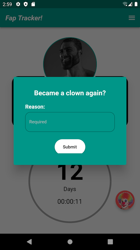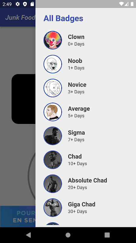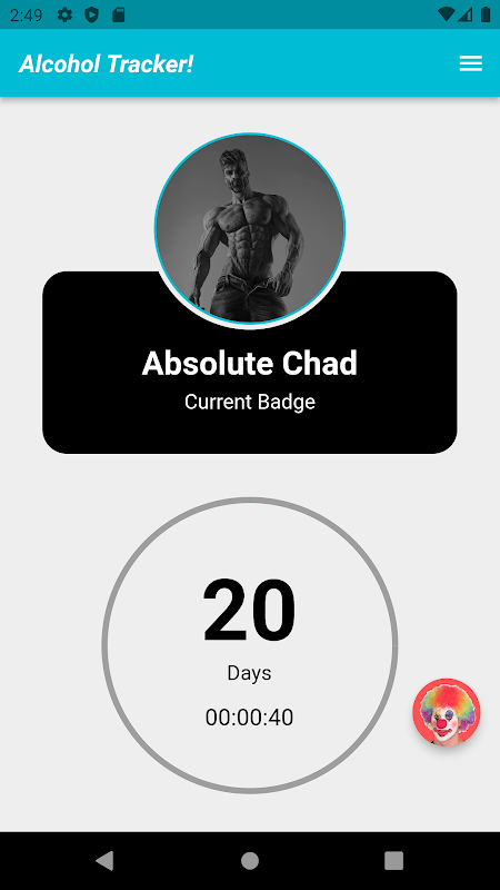 This app counts the days you have passed without eating junk food, smoking, drinking alcohol, or fapping. Just start the timer and it will start counting. If you want to reset the timer, click on the clown icon. Write down the reason you became a clown (Writing this helps to prevent doing that in the future). You can check all badges in the right drawer which will open by clicking the three-dot button in the header. Also, you can check your history by clicking the My Badge History button from the drawer.