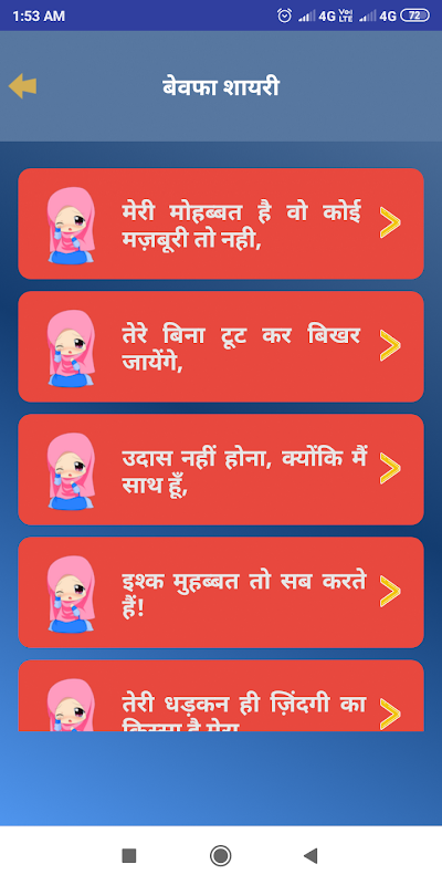 One of the best Shayari App of All time. This app contains largest collection of Bewafa Shayari, Hindi Shayari and Sad Shayari.