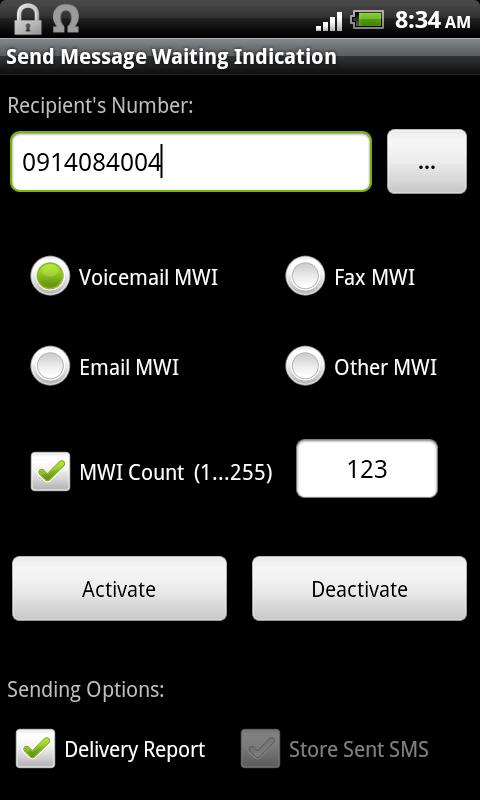 Special Message Indication (Voicemail, Fax, Email or Other indication) will be sent to the target device. With this message the sender can let the target device think that there is a voicemail (or Fax, or Email). An icon gets displayed at the target device. To clear the icon at the target device, the sender should Deactivate it. Most target devices support display Voicemail icon. Only some device (e.g Nokia) will display Fax, Email and Other indication icons.