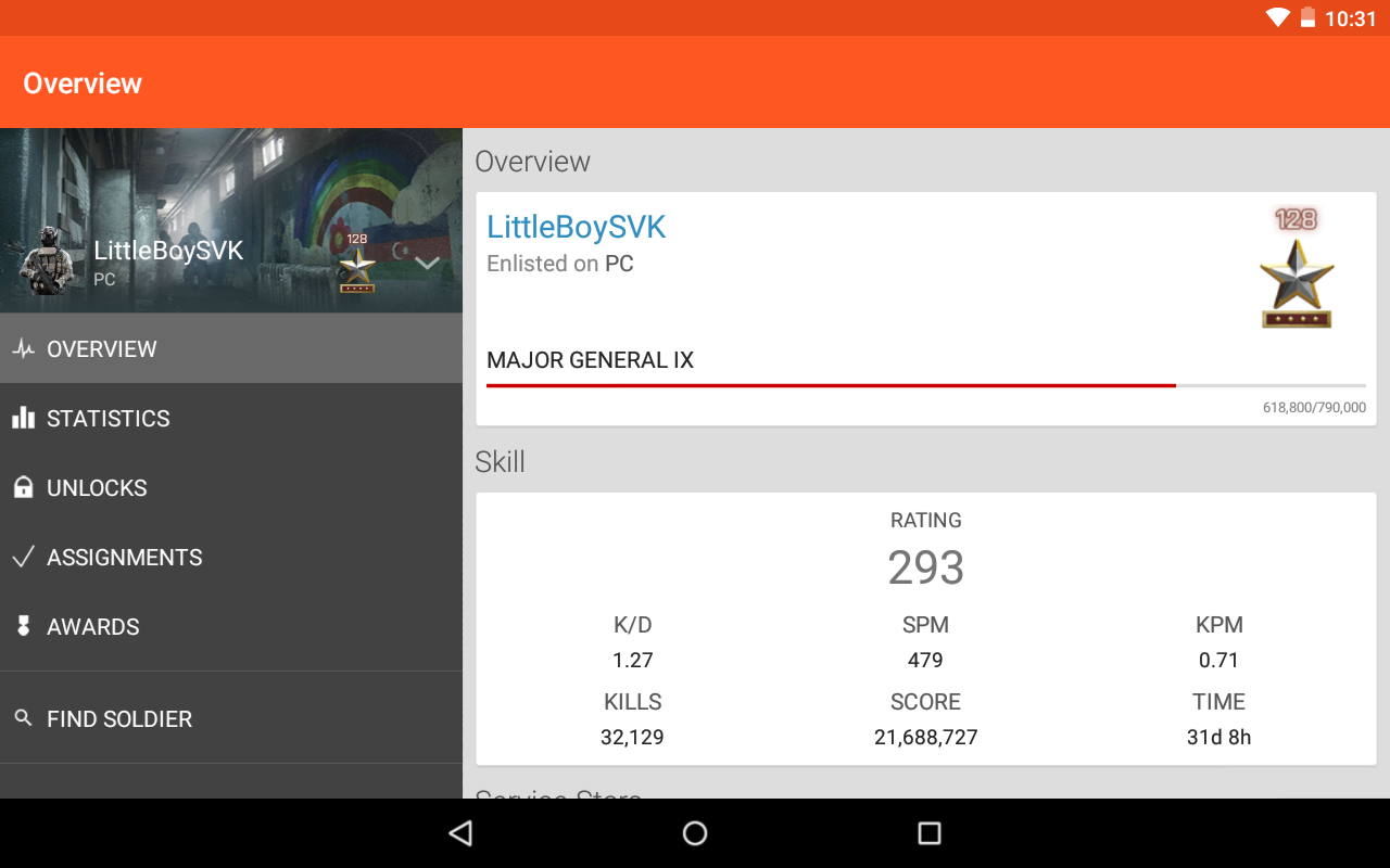 BF4 Intel is your most trusted companion on the Battlefield regardless of the platform you're playing on, or how many people you have in your party. Currently you can view your statistics, unlocks, assignments and awards, plus the added feature to view the latest Battlelog news! Most people have their phones next to them while playing, making this the ultimate app for all of you gamers out there - you won't need to have your laptop switched on as a console player, just for the sake of Battlelog. You don't need to alt-tab the game to look up your current unlocks, and miss important in-game opportunities. Just open the app, check what you need and play your best rounds ever.