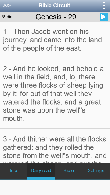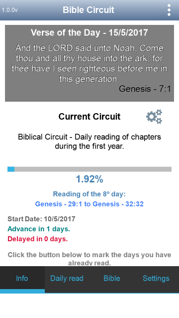 Aba - Information: Always accessible at the opening of the Biblical circuit, where the information of the current circuit is found, such as: progress, reading of the day, number of days advanced or delayed, among others. You can also view the marked notes and verses, as well as the medal table and the Classification.