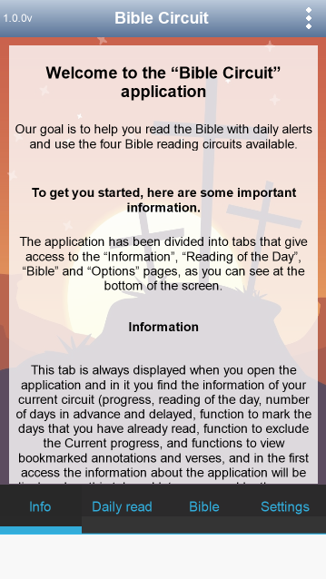 The Bible Circuit application is designed to help everyone who likes and desires to read the entire Bible. It is also a great tool to use in Bible studies and worship.