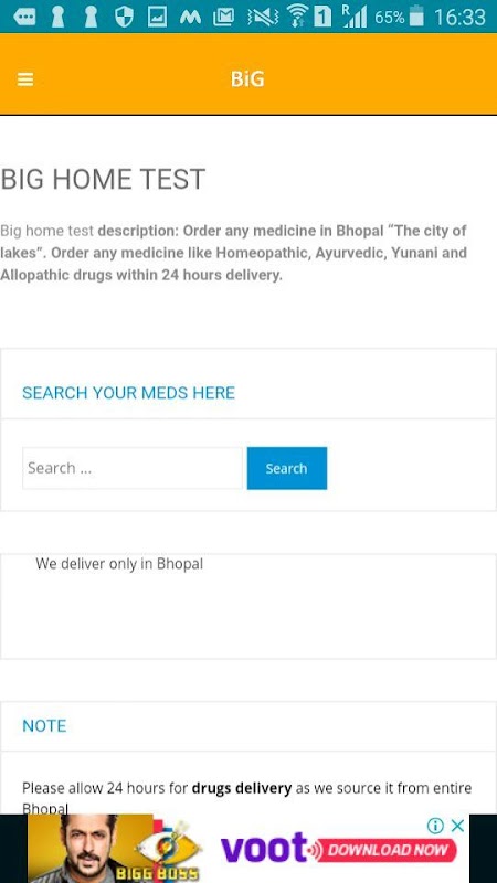 BiG home Page test description: Order any medicine in Bhopal “The city of lakes”. Order any medicine like Homeopathic, Ayurvedic, Yunani and Allopathic drugs within 24 hours delivery.