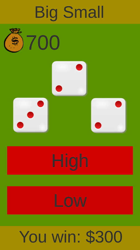 For each round of play choose high or low button for the result of the three dices and if you get it right you win!!!