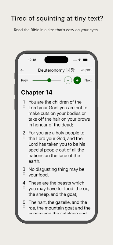 "Large Print Bible" makes Scripture reading effortless with fully adjustable text sizes, from small to extra-large. Whether you prefer big text or simply want a more comfortable reading experience, this app delivers the most enjoyable Bible reading. With a clean, simple interface and full offline access, nothing stands between you and God's Word.