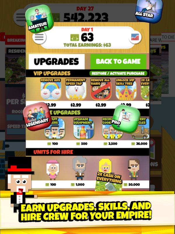 - Unlock Idle Upgrades, Skills, and Crew Members: Improve your business empire by hiring a variety of troops, upgrading incremental/idle production facilities, and sending your units on missions for business or governments to earn a large amounts of bonus billions for your clicker business.