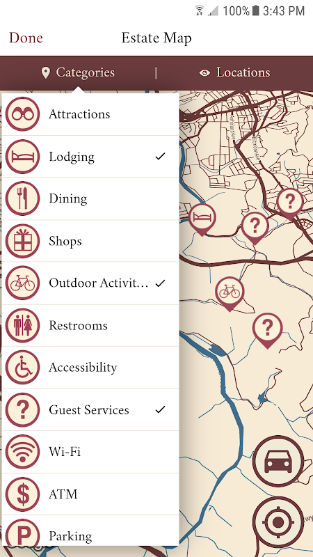 - Use the interactive, GPS-enabled map to locate points of interest across the estate, as well as restaurants, shops, and restrooms.