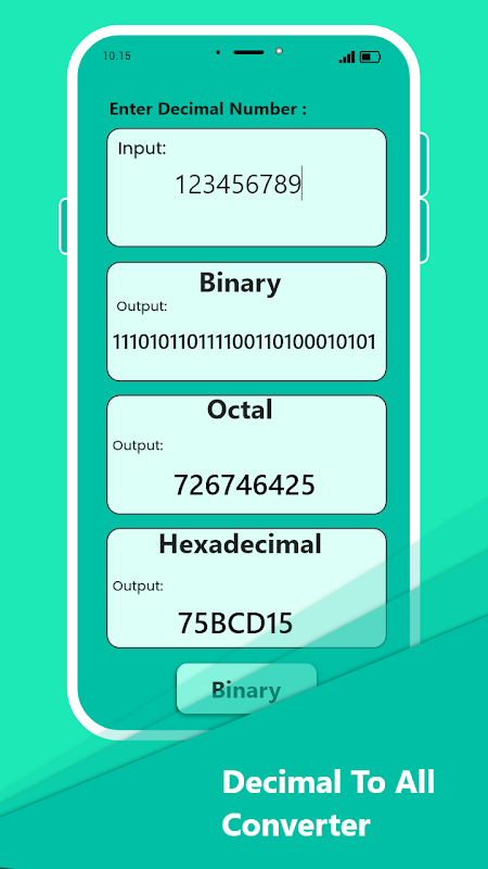 The ASCII Converter-Open Bin File app offers the opportunity to view decimal numbers in a variety of formats, including binary, octal, and hexadecimal. The decimal to binary app supports different bases; binary, octal, and hexadecimal numbers.