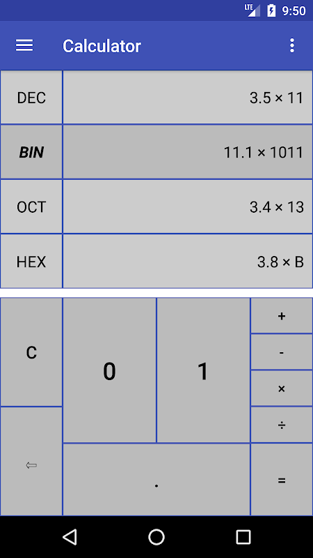 • Calculation with binary, octal, decimal, and hexadecimal numbers. Fractional numbers are supported. The supported operations are addition, subtraction, multiplication, and division. The calculator contains a separate keyboard for each number system, which makes it very easy and fast to use. The values can be copied/paste.