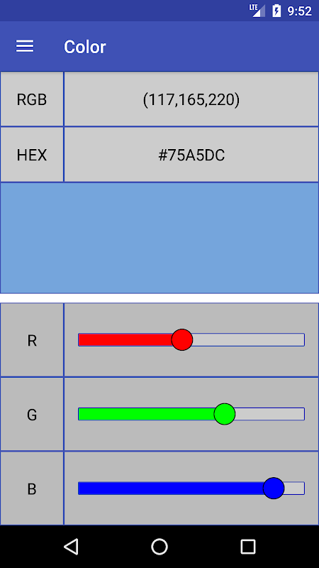 • Color representations in RGB (Red, Green, Blue) and hexadecimal format. The values can be copied.