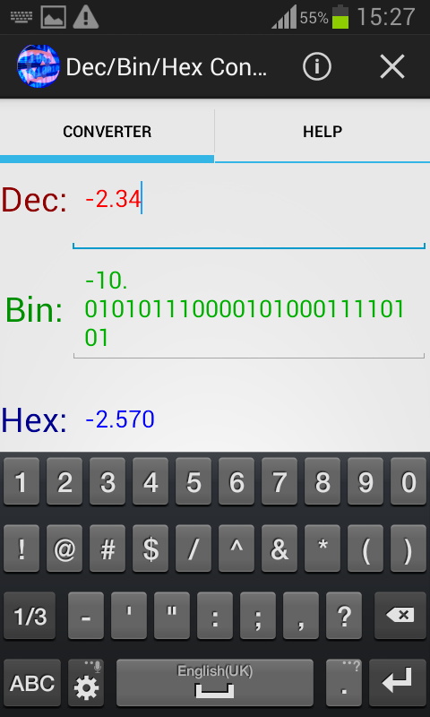 Decimal to Binary to Hexadecimal converter, supports negatives and fractions.