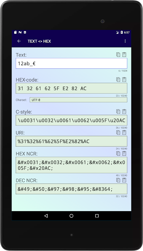 - quick translation text<>hex in selected charset (UTF-8, UTF-16, ASCII etc.).