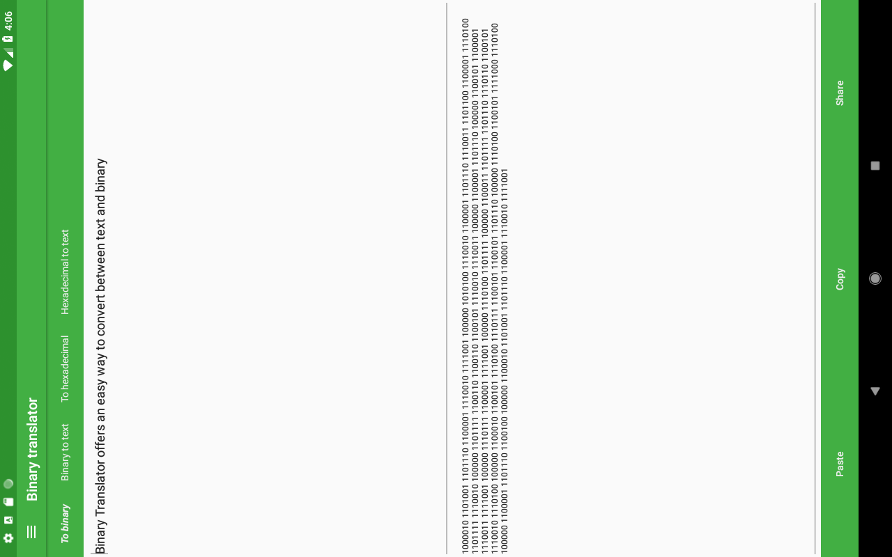This app lets you convert between text and binary. You can copy the result or share it directly with your friends. Binary Translator offers an easy way to send secret messages to friends and learn about binary.
