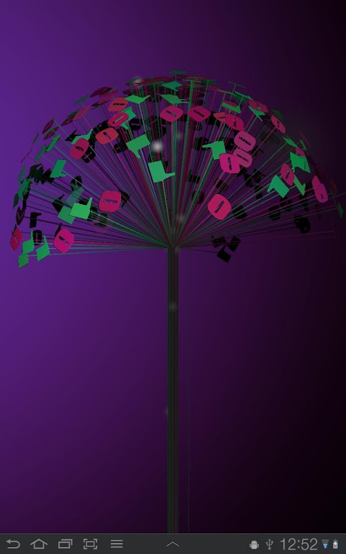 A tree with ones and zeros as leaves. Branches sway slowly and the tree spins smoothly around it's own axis as you scroll between home screens. Tree branches die after a while and fade away, and a new branch is born, growing up from the trunk led by a glowing cursor. As the branch is fully grown it explodes in a light flash and leaves a new 1 or 0 as the leaf.