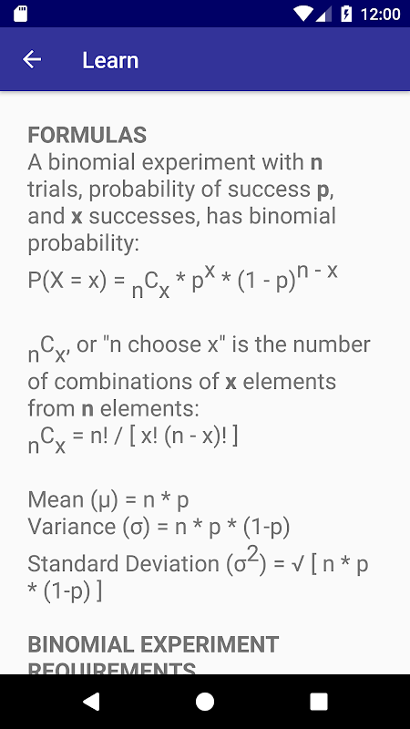 You can also view all formulas and learn about binomial experiments. Great for school!