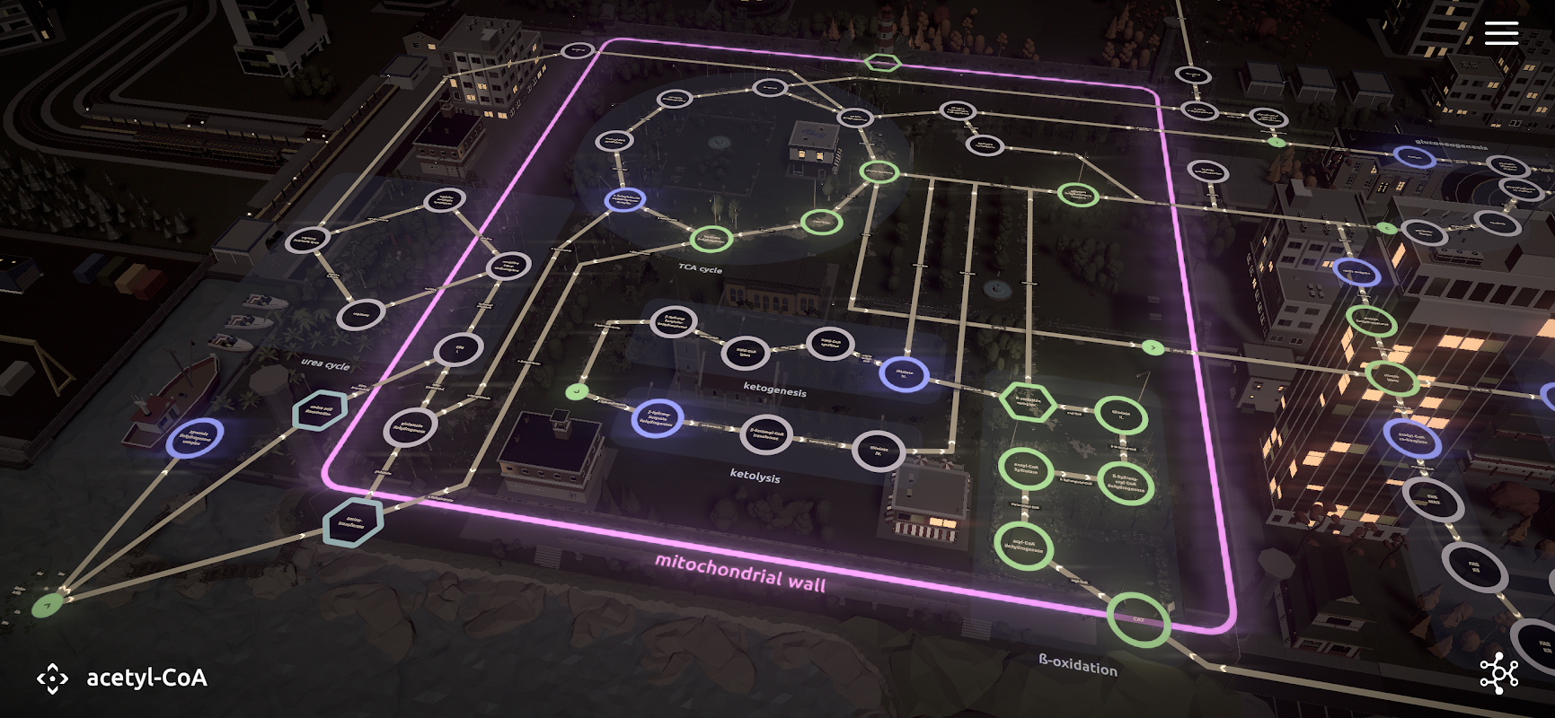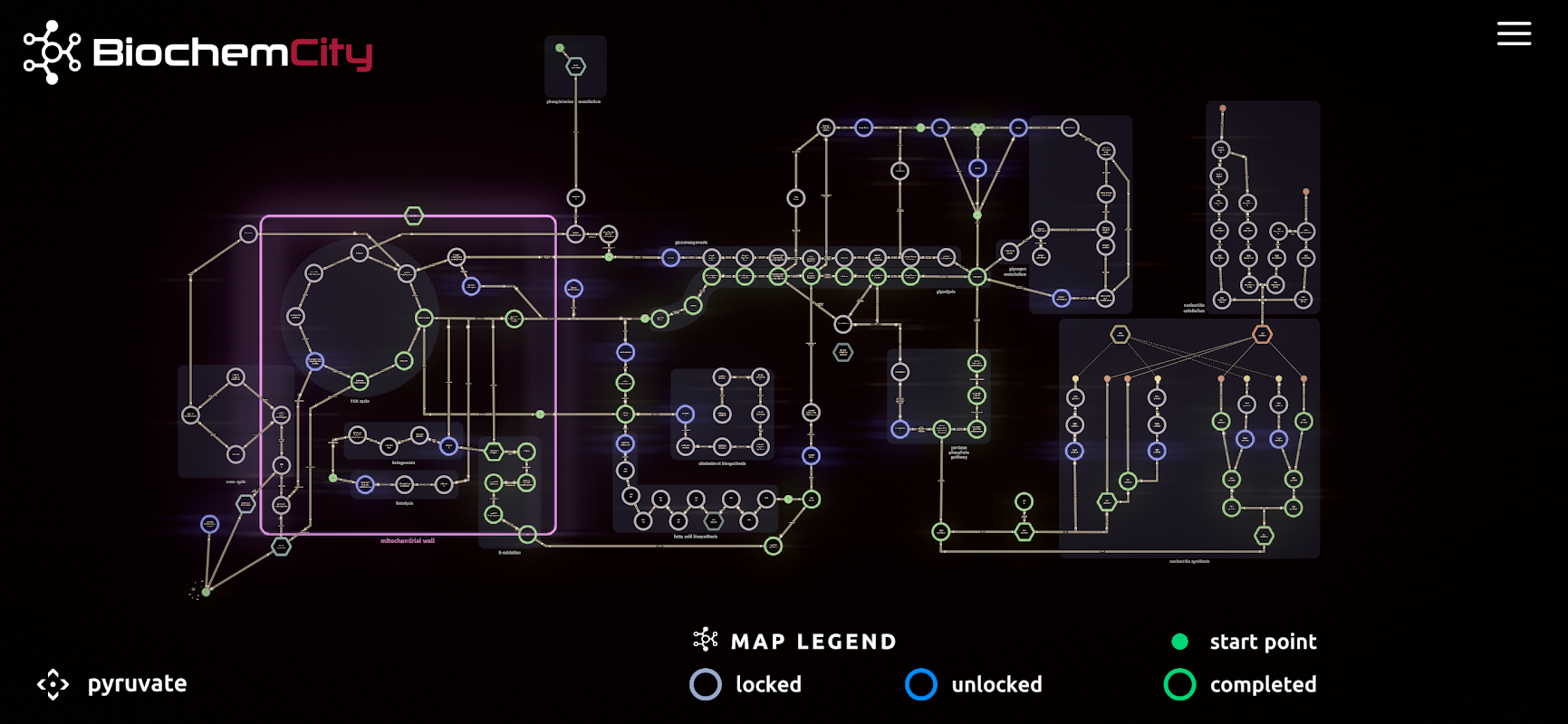 - In the 3D BiochemCity the user has to find his/her way with street lamps 'built-in' mini-games (150+), each of which hides a biochemical reaction.