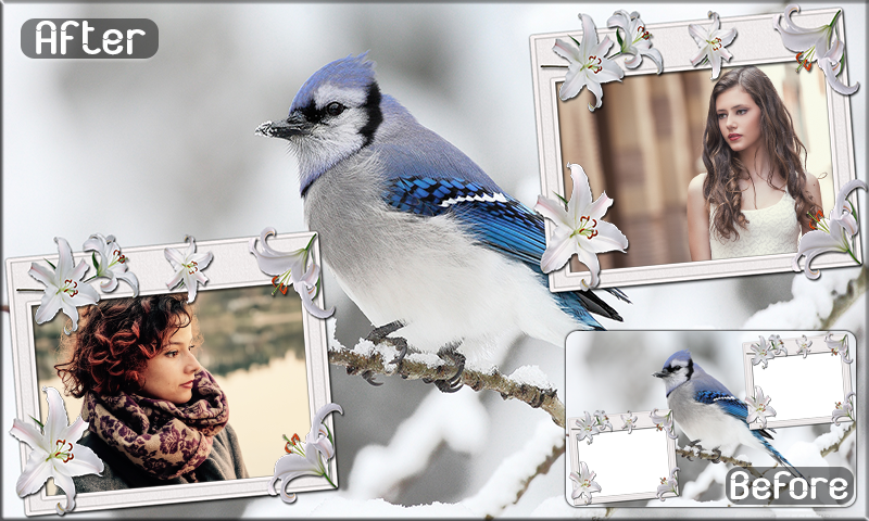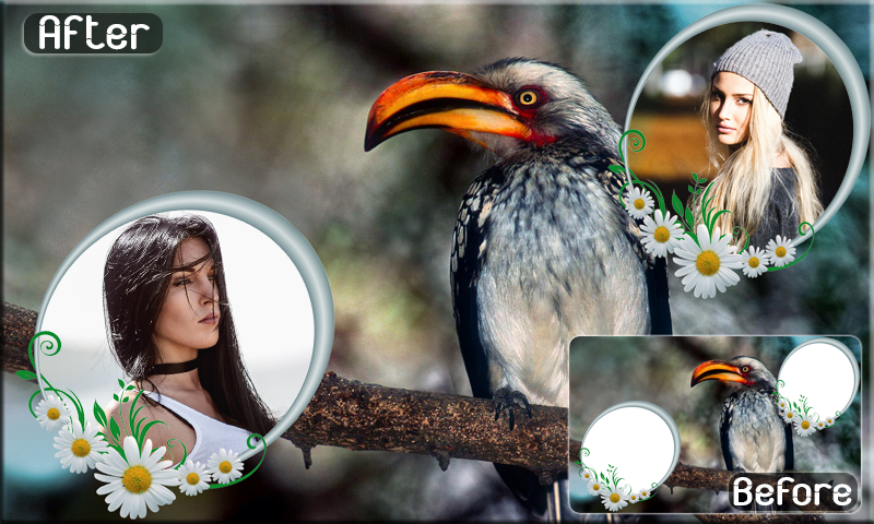 An easy to use app to create Dual image with Love Bird Dual Photo Frames. The app contains many self-designed shape where you can place dual pic of you and your liking once. The fixture are designed with fowl themes. You can pick any from many given fixture within the app itself.