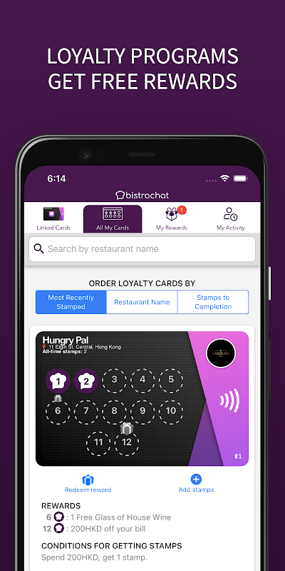 • Get stamps, rewards, cash back and discounts (free dinners, free bottles of wine, up to 800 HKD cash back). With Bistrochat, you get stamps when you dine out with your QR code or NFC Contactless loyalty card!