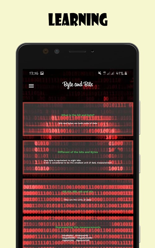 This app can to Calculate between bits and bytes and you can learn about different in bit and byte.