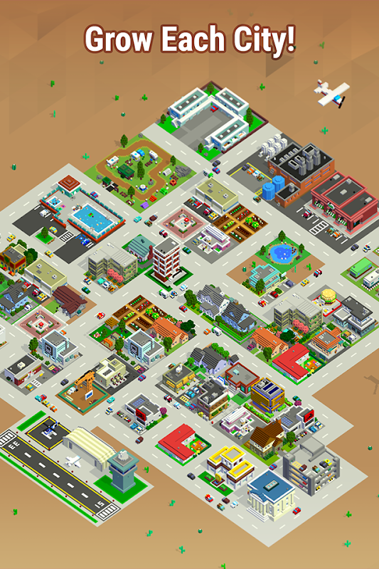 Build your Bit City and make your citizens happy! Start from a tiny town and grow to a thriving metropolis in the idle building game from the creators of Tiny Tower. Collect profits and invest in upgrades that keep your city growing. Fill your city with new types of cars, planes and ships. Unlock new buildings, including famous landmarks, to design the look of your city.