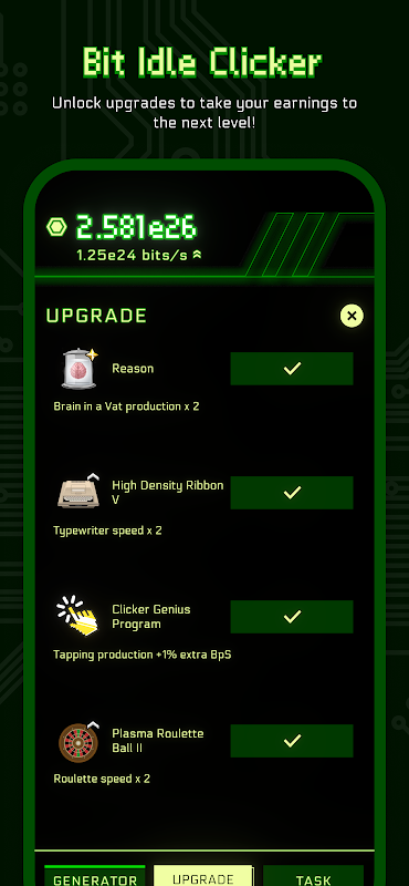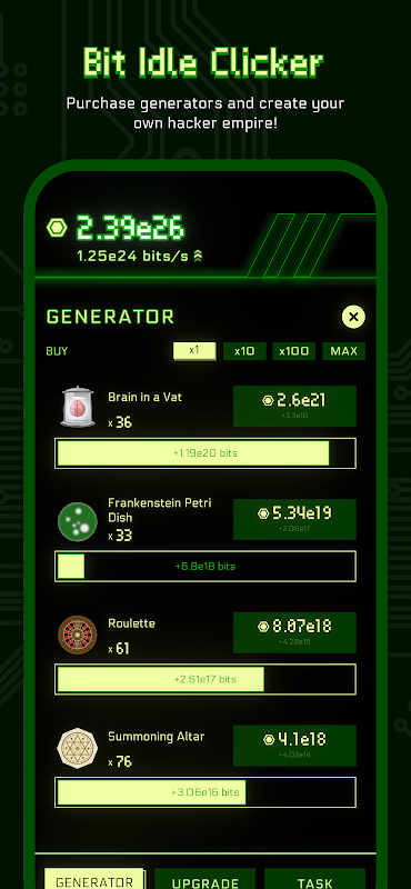"Bit Idle Clicker" is a casual idle clicker game where players earn in-game currency (bits) by clicking and purchasing various upgrades. The game is set in a science fiction background, where the protagonist wakes up trapped in a locked room and must complete various tasks to escape and uncover the truth. Players can choose different branching storylines to continue playing until they reach the game's ending.