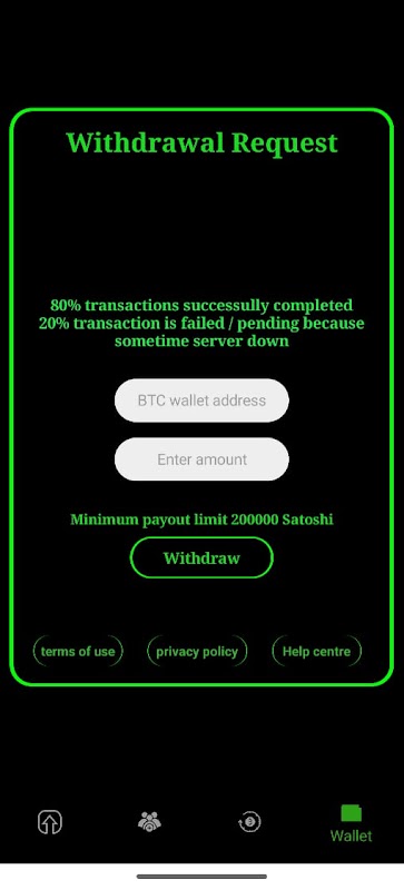 Once the minimum withdrawal threshold is reached, users can withdraw their earnings to their Bitcoin wallet quickly and securely.