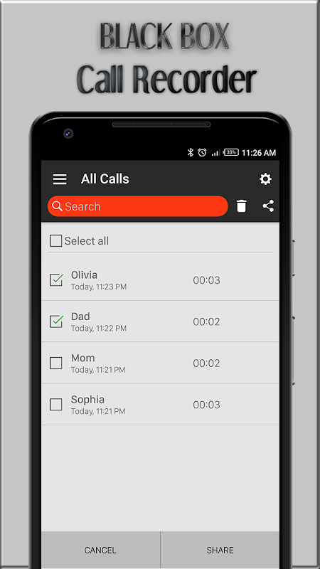 Black box call recorder app allows you to record phone calls and manage recording files in a smart way with a lot of features like play, listen, share, delete, trim recordings and rename call recordings, multiple audio formats, add to favorite, voice recorder etc.