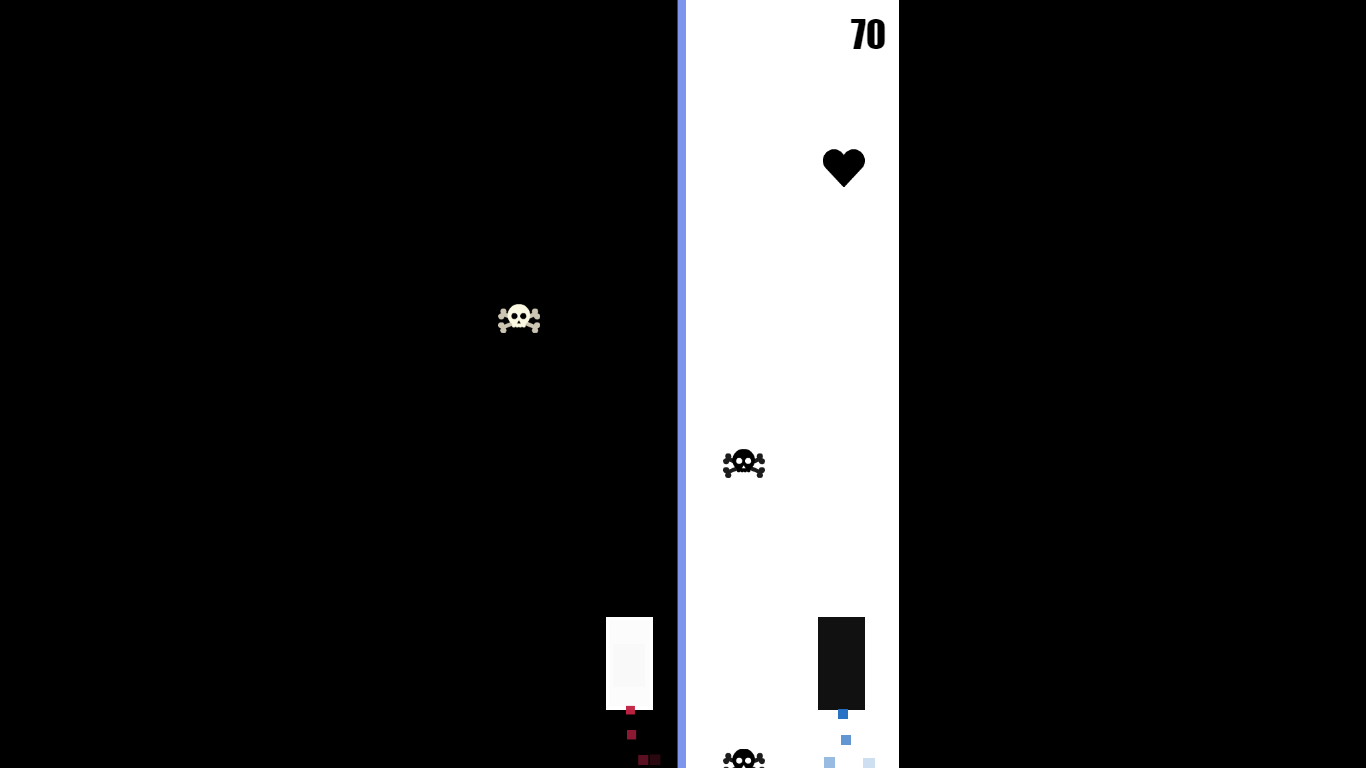 Your game characters are the two squares, black & white. The challange of this game is to avoid all the skulls but do not miss any of the hearts! To do this, simply move the squares left and right.