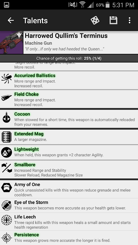 Lists all the talents guns in Destiny can have and keeps track of ones you want!