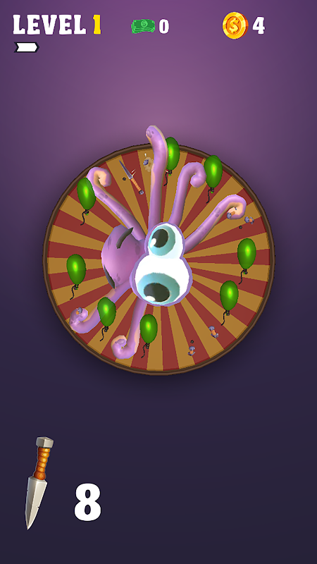 Blades Out is a fun knife throwing game. Challenge yourself, show pace and accuracy, hit them balloons, and become guru of knives throwing. Collect coin for each balloon you burst, trade them for better knives and throw them all, hit the target, and earn more and more coin. But, make sure not to hit poor octopus she's just doing her job!