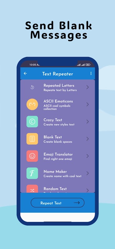 Blank Text Generator for WhatsApp is the perfect way to send Invisible Text messages, to your friends, and have some fun. With this app, you can make blank texts, invisible text, disappearing texts, text to emoji, Text Repeater, Stylish Name Maker,
