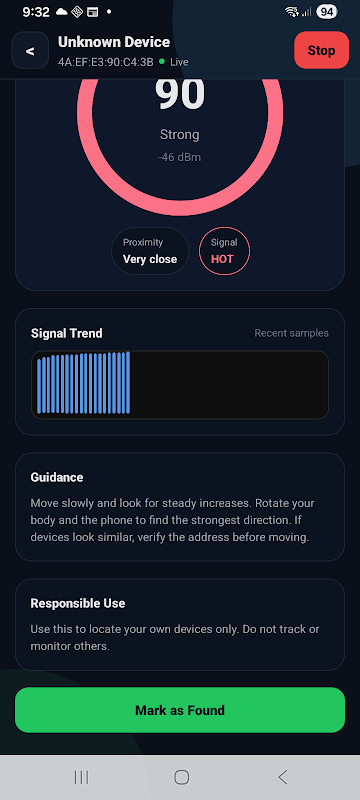 BLE Finder helps you locate your own Bluetooth Low Energy (BLE) devices by scanning nearby advertisements and visualizing signal strength (RSSI). This app scans only—it does not pair or connect.