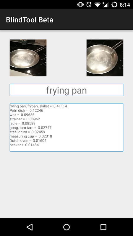 This app tells you what it is looking at and vibrates based on how confident it is. When using this app you will wave the phone around you until you feel it vibrating more and more which means you are getting closer to an object it understands.