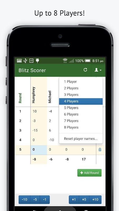 Keep score for round based card games such as Dutch Blitz or Hearts. 1-8 players