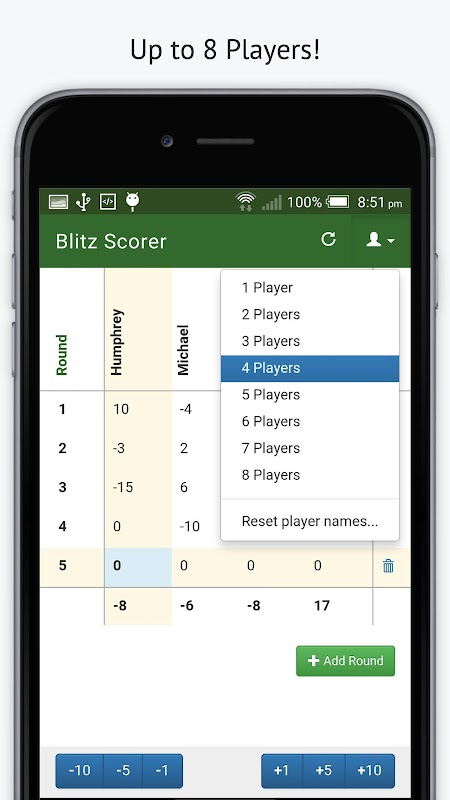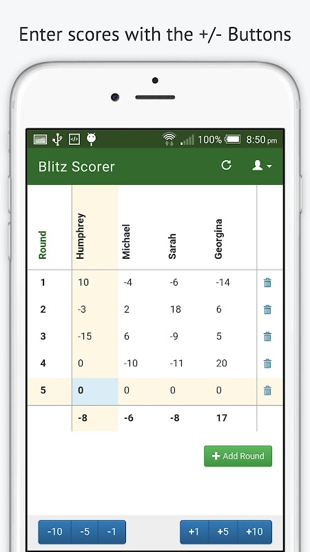 - Simple +1, +5, +10, and -1, -5, -10 buttons for adjusting score.