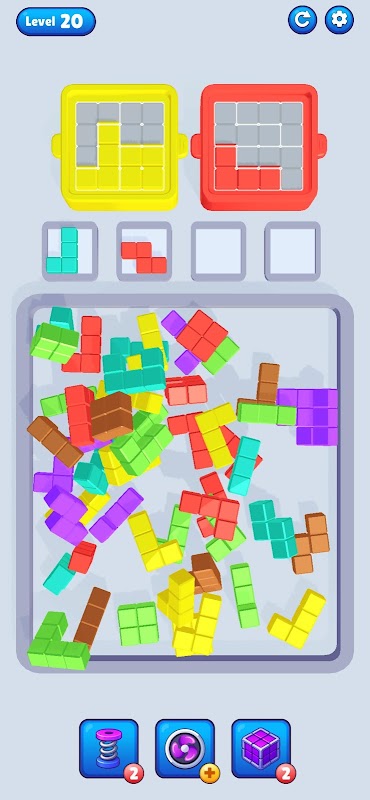 Fit colorful 3D blocks into matching grids—plan smart or overflow your tray!