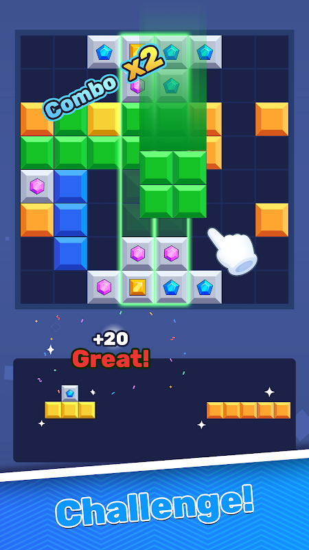 - Place colorful blocks on the 8x8 board to complete full rows or columns and clear space!
