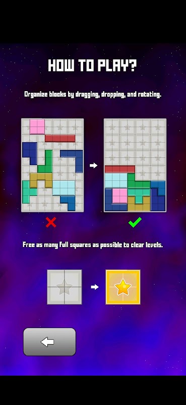 Rotate and move various shaped blocks on a grid-based floor to uncover star-shaped tiles. Each tile is made of 4 smaller parts – you must leave all parts uncovered to collect the tile! Sounds simple? Think again.