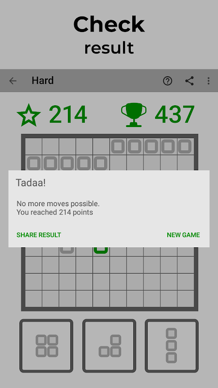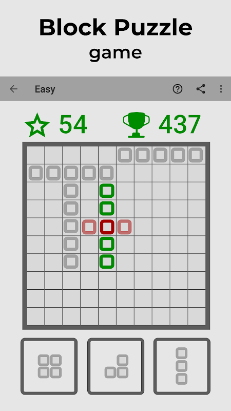 The goal of Block Puzzle is to accumulate as many points as possible. Points are earned by placing pieces on the board, with larger pieces giving you more points. When you fill a line (row or column), it gets removed from the field. The more lines you remove at once, the more points you score. After placing all pieces, new pieces are generated. The game ends when no more options remain for placing the current pieces.