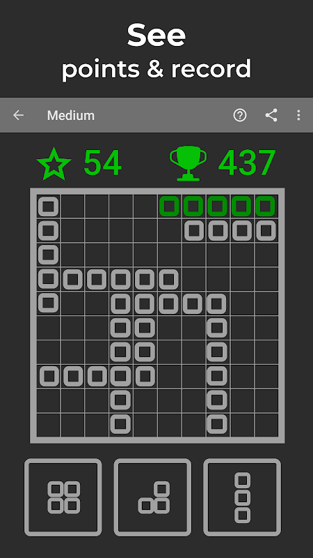 In lower difficulty levels, a helpful feature shows which lines will be removed when you hover over with a piece. This aid is not available in higher difficulty levels, increasing the challenge for advanced players.