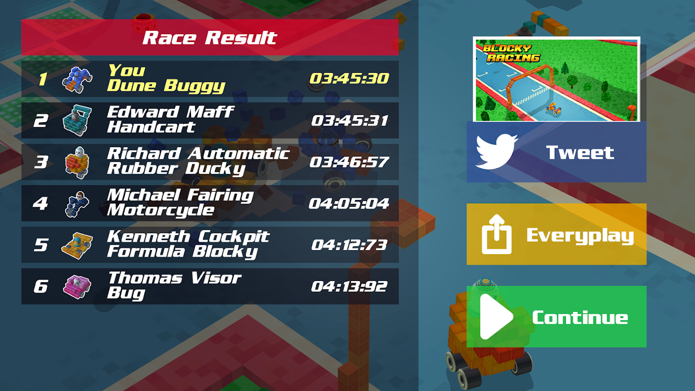 Blocks Racing is classic kart racing game madness. Speed your way through 55 unique tracks equipped with shortcuts for advantage. Unlock new racers with varying stats based on the vehicle design.