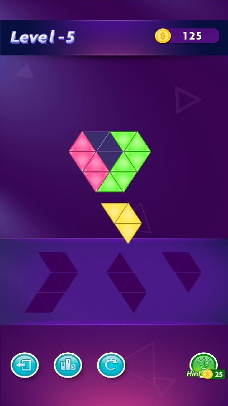 Blocks Triangle is a casual puzzle game that requires you to use your noggin! This is a puzzle game set against a blue and purple background with colorful tiles that you can drag to the white outline. Your objective is to completely fill up the white outline with the tiles available. Each level presents a new shape and challenge ready for you to solve. Some of them will have more complex outlines, tiles, and more pieces to place. There are 50 levels of puzzles for you to play and to figure out. While you do have to use your brain, this is still a calming game with no timer to stress you out. With every game, win coins that you can use to unlock hints to help you solve more difficult levels. Select the scoreboard icon to see where you rank against other Blocks Triangle players. Just pull out your phone or go to your computer to play this brainteaser game.