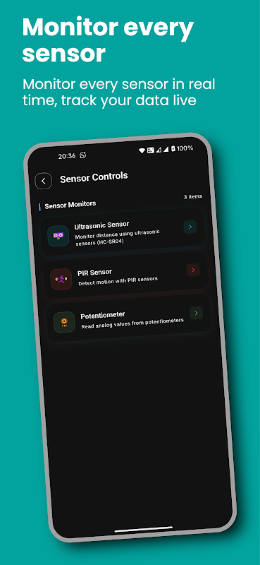 📡 Sensor Dashboard — Monitor real-time data from HC-SR04 ultrasonic sensors, DHT11/DHT22 temperature sensors, PIR motion sensors, and more — streamed live over Bluetooth.