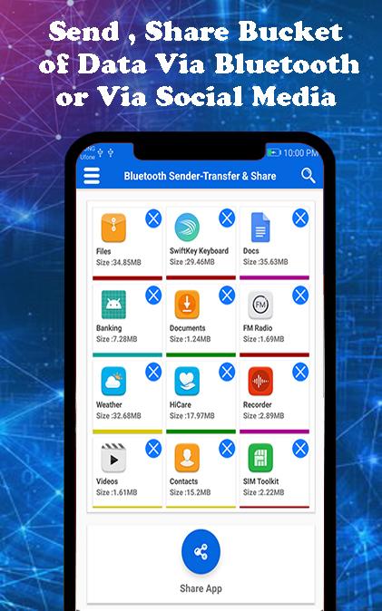 Bluetooth Sender CloneIT Bluetooth Transfer Easy Connect Share is one of the best app for transfer and share any data any time with out any cable .Bluetooth App transfer is amazing app for transfer app easily .And the best part of Bluetooth Sender - Transfer & Share and flexible feature that you can select multiple Applications, multiple audios, multiple videos, multiple pictures , multiple file and all sort of files, all together and share or transfer it, and There is no restriction on what to 🔗 share or transfer totally free of cost .