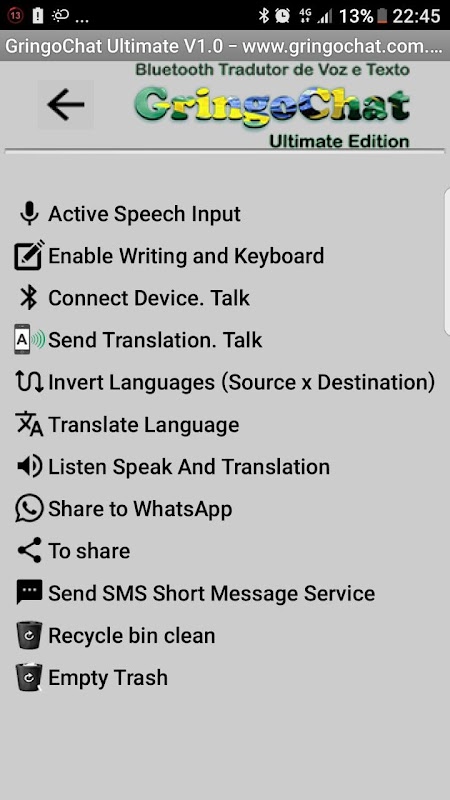 GringoChat Ultimation Edition is an innovative Voice and Text Simultaneous Translator with Bluetooth. This groundbreaking app translates your voice or typed text and quickly transmits the conversation content to the device of another person previously connected via Bluetooth, enabling efficient communication at a distance.