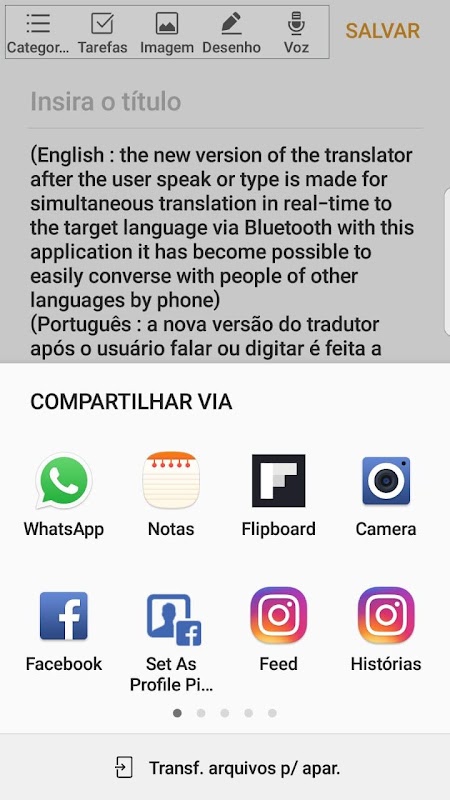 After translation, the user can listen to both the original and translated text, as well as share this information on various internet-connected apps such as Google Plus, Gmail, WhatsApp, Skype, Facebook, Messenger, text editors, Notepad, and others installed on the device.